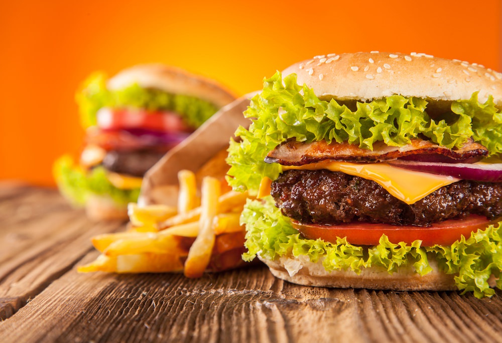 De double spicyburger bestaat uit twee burgers, kaas, bacon, verse groenten en hamburgersaus. In een menu met patat en drinken.
